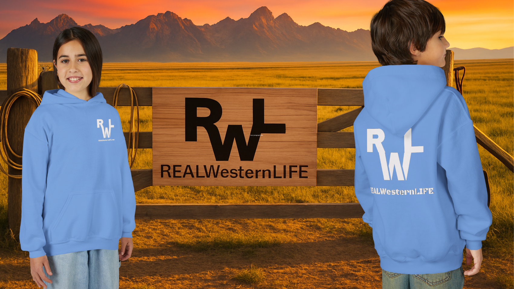 Real Western Life Kids Custom Brand sweatshirt, perfect for young cowboys and cowgirls. This cozy hoodie provides warmth and style for children who enjoy rodeos, western-themed events, and country living.