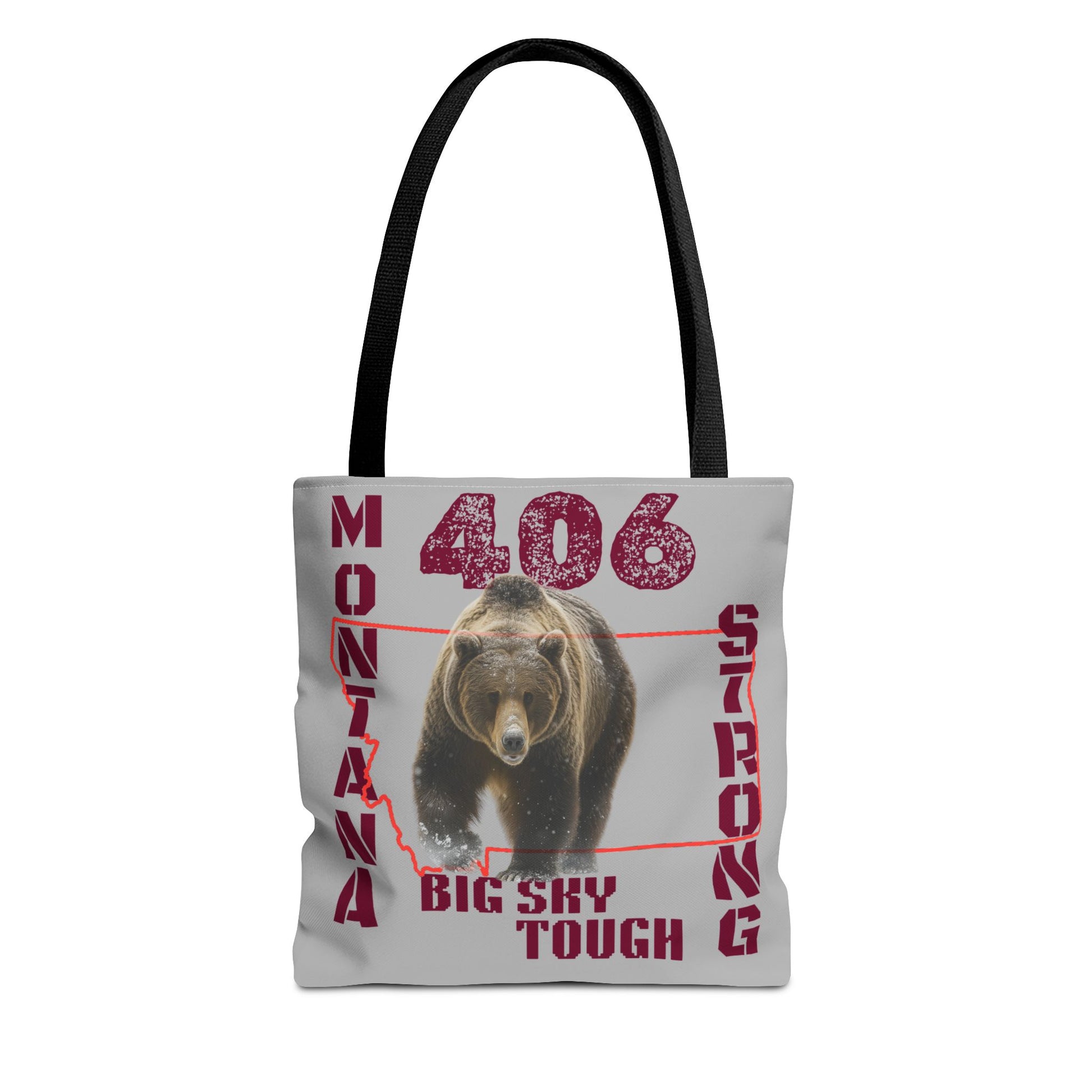 Introducing a stylish and functional Tote Bag. Show your pride and strength with this Montana Strong tote bag featuring the state's 406 area with a bear and states outline. Perfect for everyday use and as a statement piece. Ideal for Montana residents, travelers, and outdoor enthusiasts. Relevant for Montana Day, celebrations, and as a gift for someone with ties to Montana. The tpte is perfect for anyone looking to add a touch of personality to their everyday excursions. Perfect for Adventurers, Gifts for Montana Lovers, Eco-Friendly Shopping, Travel Companion, Gym Bag With its eye-catching design and strong build, this tote exudes a confident, adventurous vibe, making it ideal for outdoor enthusiasts, students, or anyone on the go. Its versatile nature ensures it fits seamlessly into any lifestyle, whether you're heading to the beach, running errands, or exploring local markets. This tote bag makes a thoughtful gift for birthdays, holidays, or just because, and it's perfect for celebrating summer adventures or fall outings with friends.